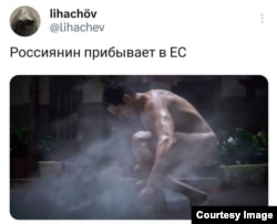 А интернет моментально заполнился мемами, где полуголые россияне расстаются с вещами на границе Евросоюза. Первым делом вспомнился известный мем с Арнольдом Шварценеггером в роли Терминатора. В новой версии прибывший в бар абсолютно голым киборг вместо одежды и мотоцикла требует чемодан, смартфон и туалетную бумагу.
