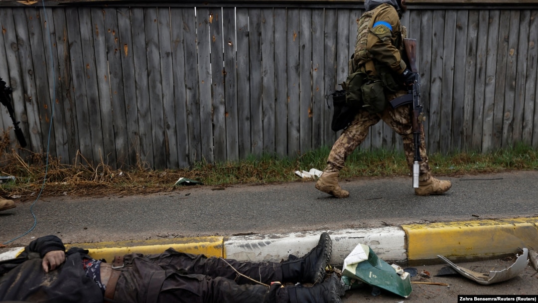 Вечером 2 апреля журналисты Reuters опубликовали шокирующие фотографии с улиц Бучи. На них видны тела убитых в гражданской одежде, которыми усеяны улицы, – 16 из 20 тел, как показал фотограф France Press, лежали на тротуаре или около бордюра, три тела – посередине дороги, еще одно – во дворе разрушенного дома. У некоторых из них были завязаны глаза и руки за спиной, многие убиты выстрелами в затылок. Сам город практически разрушен, на фото сожженные машины и поврежденные снарядами и ракетами дома.